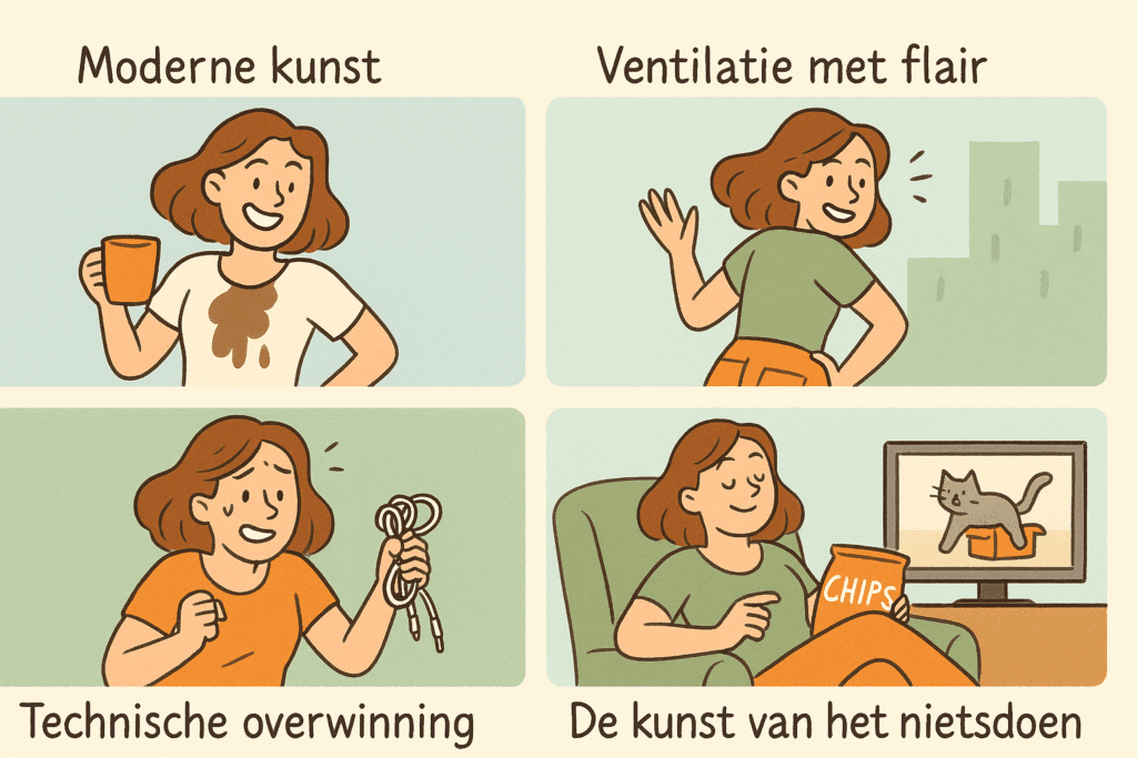 We kennen allemaal wel die persoon die eruitziet alsof ze het leven perfect op orde hebben. Maar het geheim is: dat hebben ze niet. Niemand heeft dat. Het verschil is dat sommige mensen gewoon beter zijn in doen alsof. Dus omarm je innerlijke kluns! Je valt van je fiets? Zwaai alsof het de bedoeling was. Je broek scheurt midden in een openbare ruimte? Noem het gewoon luchtcirculatie. Alles draait om de presentatie.
